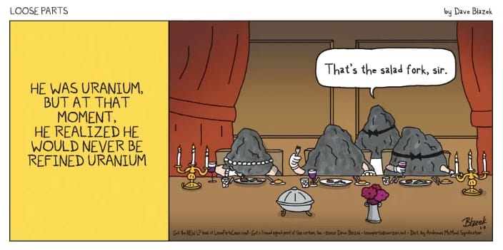 At a classy dinner, one rock realizes he’ll never be refined uranium. Especially when corrected on salad fork etiquette. Rock-bottom, indeed.