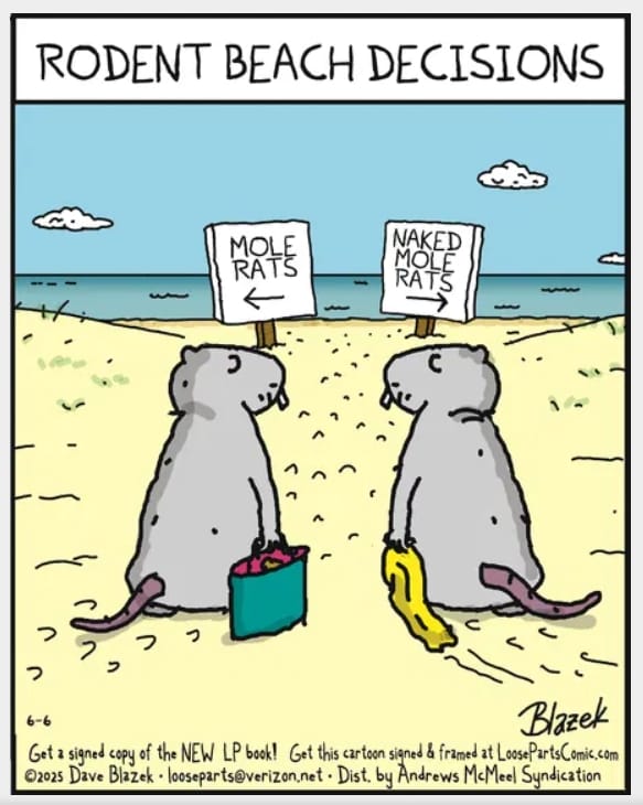 Two rodents ponder beach signs: “Mole Rats” or “Naked Mole Rats.” One holds a towel nervously. The other? Fully chill with the exposure.