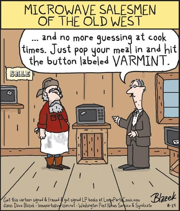 An Old West salesman boasts a microwave with a button labeled “VARMINT.” The best part? The buyer nods like it’s totally normal.