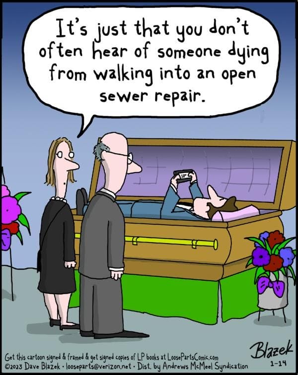 At a funeral, someone remarks it’s rare to die from falling into a sewer repair. Not impossible though, apparently. Morbid? Yes. Funny? Definitely.
