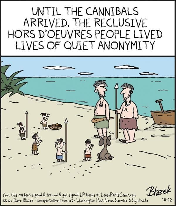 The cannibals arrive, and the “Hors d’Oeuvres People” realize their peaceful anonymity is over. It’s niche humor, but it bites.