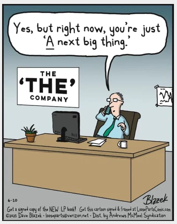 A CEO crushes dreams by clarifying someone is not the next big thing—but merely a next big thing. Corporate pep talks, redefined.