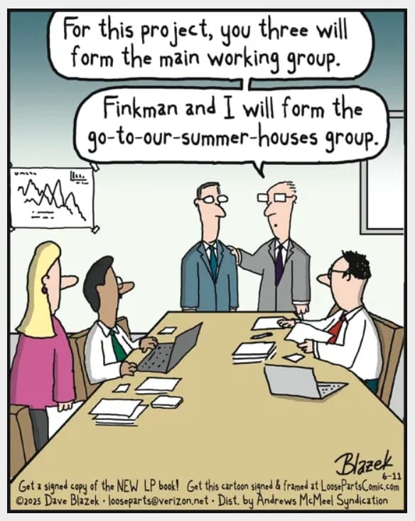 Executives split a work project between staff and a getaway crew—dubbed the “go-to-our-summer-houses group.” Nothing like executive delegation with a tan.