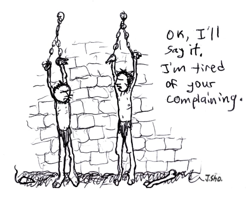 Even torture can’t silence the petty complaints. A deeply dark, wonderfully wrong slice of gallows humor.