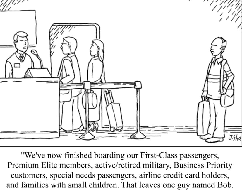Poor Bob. He’s not elite, premium, or platinum—he’s just Bob. And this cartoon captures modern air travel’s absurd caste system perfectly.