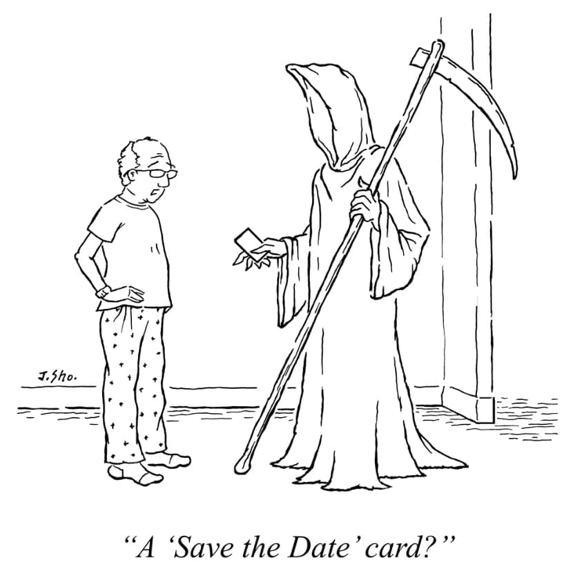 Who says death has no manners? The Grim Reaper gets surprisingly formal in this cartoon that gives dark humor a new RSVP.