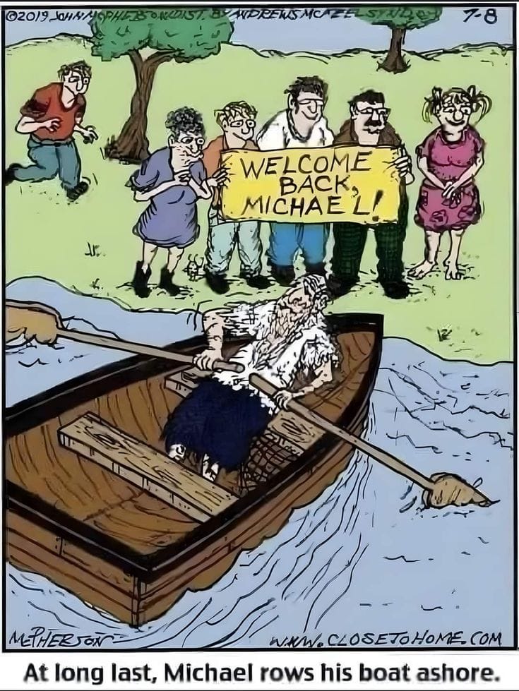 Michael finally rows ashore, and his family greets him like he’s been gone for decades. It’s oddly sentimental and sneakily funny, like a castaway sitcom punchline.