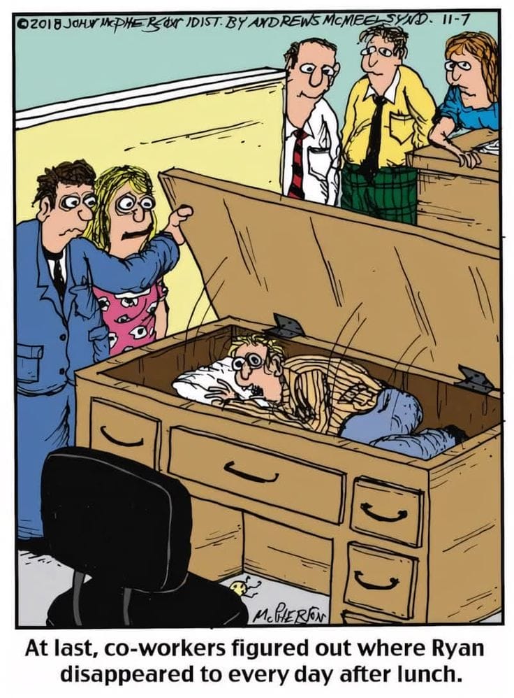 Ryan’s secret nap space under his desk is busted! A classic take on the eternal office struggle to survive post-lunch drowsiness. Genius in its simplicity.