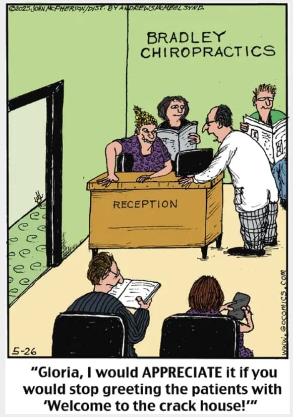 Let’s just say Gloria’s customer service skills could use work. A receptionist greeting patients with “Welcome to the crack house” is hilariously unprofessional in the most cartoonish way.