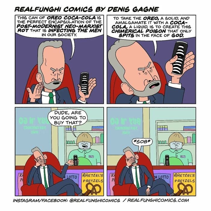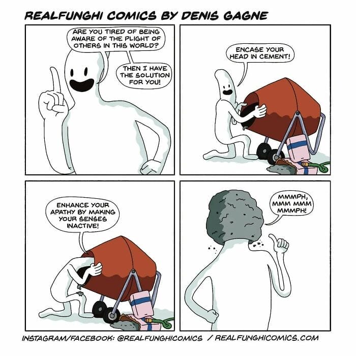 Dennis Gagne, the genius behind Real Funghi Comics has a simple yet brilliant philosophy. We live in a ridiculous world and we can’t help but engage in it ridiculously. This sums up his approach to comedy perfectly turning the absurdities of life into hilarious surreal comics. Inspired by his love for Kids in the Hall, Mel Brooks and David Lynch Dennis embraces a surreal and satirical style in his work. He’s always observing the strange moments in everyday life turning them into quirky comics that speak to fans of the bizarre and unconventional. In Gagne’s world even the darkest or oddest themes are met with a playful grin. His comics provide a welcome escape for anyone who finds joy in laughing at the peculiarities of life.