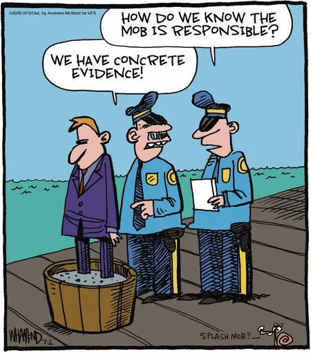 Classic comic noir, Reality Check style. Mob jokes + literal “concrete evidence” = dad-joke heaven.