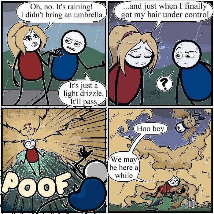 When we asked the artist where they find inspiration for new strips, they told us. I usually come up with a comic in one of two ways. First, I might start with a simple everyday situation and see if I can turn it into something wild and unexpected. Or, I’ll take a familiar phrase and try to twist its meaning without changing the words too much. I always jot down any ideas that come to mind because you never know when something that seems like a dead-end could turn into a great comic.