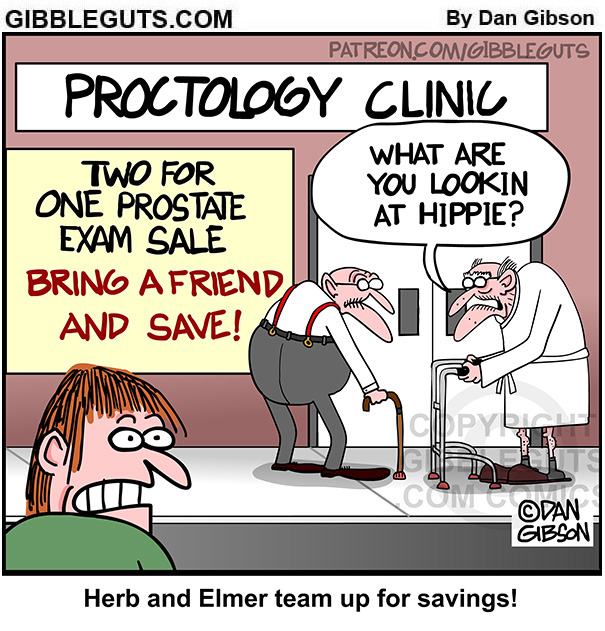 Herb and Elmer take advantage of a “two-for-one” prostate exam special. Nothing says friendship like holding hands in the waiting room—and sharing awkward medical discounts.