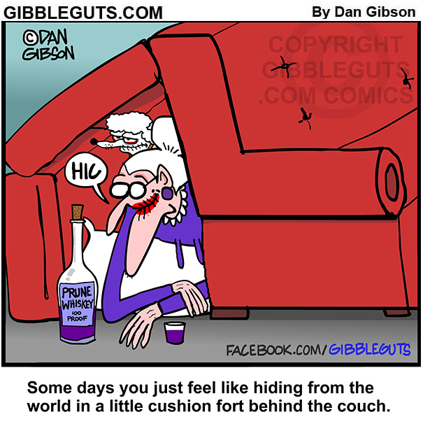 Some days you just need a cushion fort, a bottle of prune whiskey, and your dog for company. Adulting is hard—sometimes hiding out behind the couch is the only logical response.