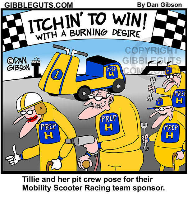 Tillie and her crew suit up in “Prep H” uniforms for the annual mobility scooter races. With that kind of pit crew, first prize is guaranteed—or at least a really smooth ride.