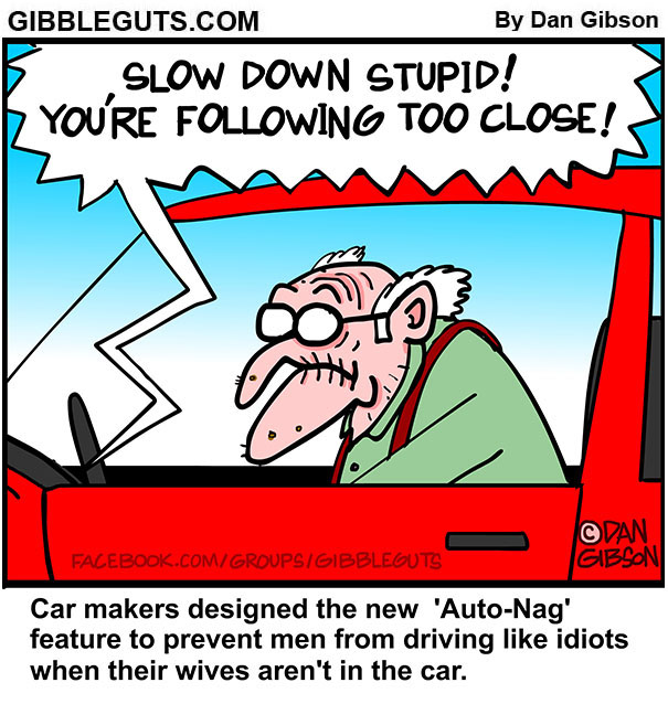 New cars now come with the “Auto-Nag” feature, ready to nag you about your driving even when your spouse isn’t there. “Slow down, stupid!”—now available in surround sound.