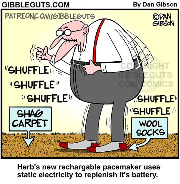 Herb shuffles across shag carpet in wool socks to recharge his pacemaker with static electricity. When your steps can literally jumpstart your heart, you know you’ve reached peak retirement.