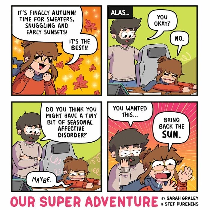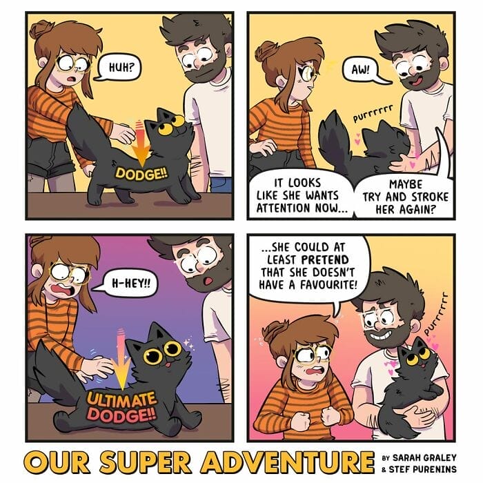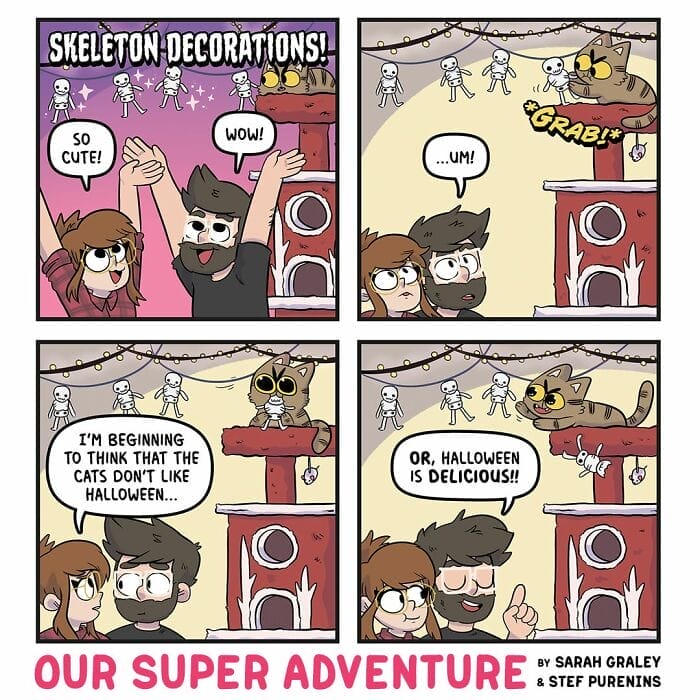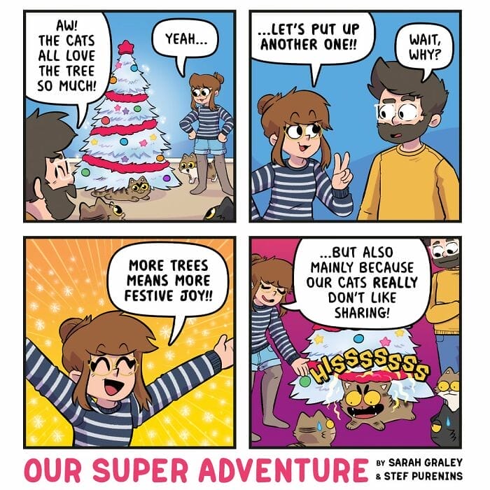 Her popular series Our Super Adventure offers a hilarious heartwarming look into the chaos and joy of daily life. From navigating the ups and downs of relationships to dealing with the charming mischief of her cats, Sarah’s comics provide a lighthearted and relatable view of life’s little moments. If you’re a cat lover or just enjoy funny stories about relationships, Sarah’s work is sure to brighten your day with its perfect mix of warmth and humor.