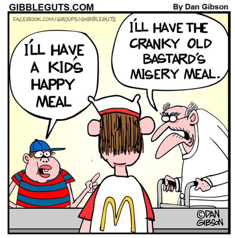 Forget Happy Meals — grumpy elders want value-sized bitterness. A brilliant jab at fast food marketing with a dollop of geriatric sarcasm.