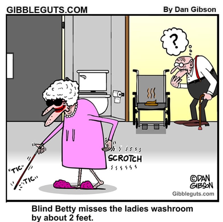 Blind Betty veers a couple feet off course… directly into someone’s wheelchair. This comic is a reminder: sometimes aiming is everything.