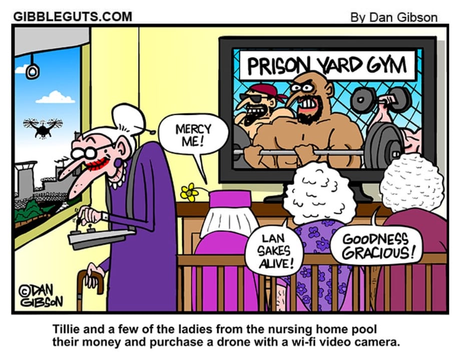 Senior ladies get frisky from afar by spying on buff inmates via drone. It’s creepy, clever, and absolutely hysterical.