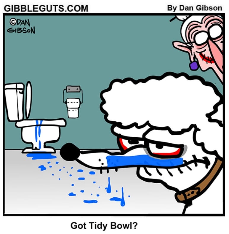 The family poodle gets a blue mustache from some very unfortunate toilet water. The look of disgust is as priceless as it is relatable for pet owners.