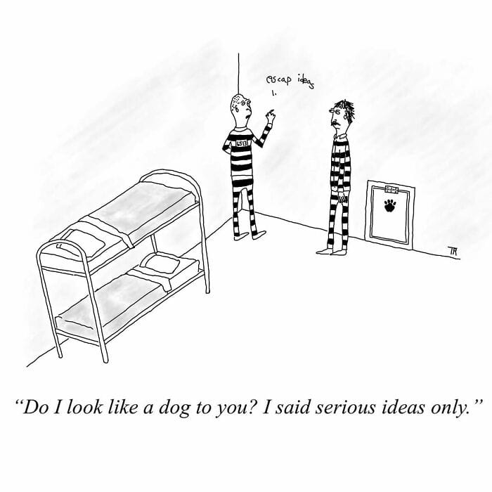 A prisoner is disappointed by his cellmate’s dog-door idea. “Do I look like a dog to you?” The brilliance here lies in the dog-paw-sized escape hatch, and the look of utter defeat. Genius minimalism.