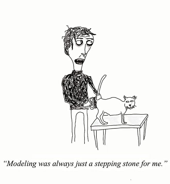 “Modeling was a stepping stone,” says a guy awkwardly holding a cat. What’s next? Cat-herding? The blank stare of both man and feline seals this one-panel slice of artistic confusion.