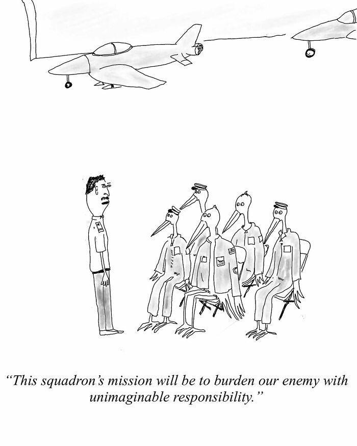 “This mission is to burden the enemy with unimaginable responsibility.” A team of birds in military attire listen solemnly. Reese’s satire strikes again—warfare replaced with the crushing weight of adulting.
