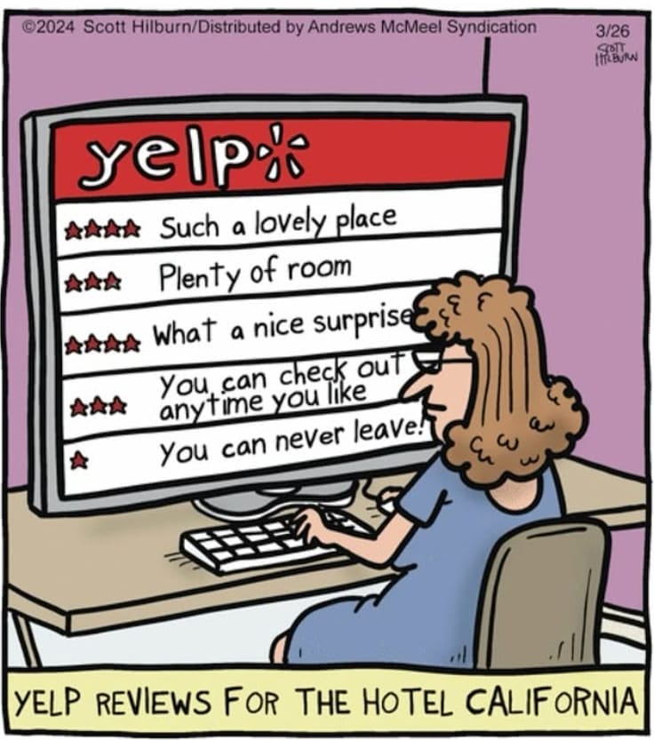 A Yelp review for the Hotel California? Genius. “You can check out anytime you like, but you can never leave” makes a perfect review line. You’ll hum The Eagles while laughing.