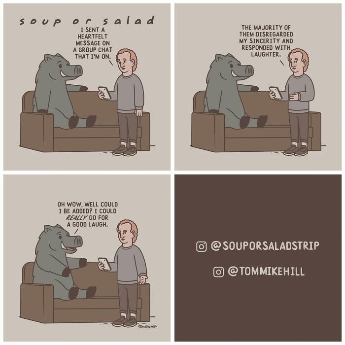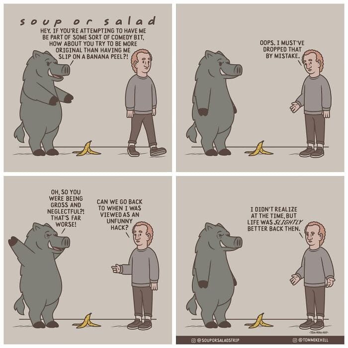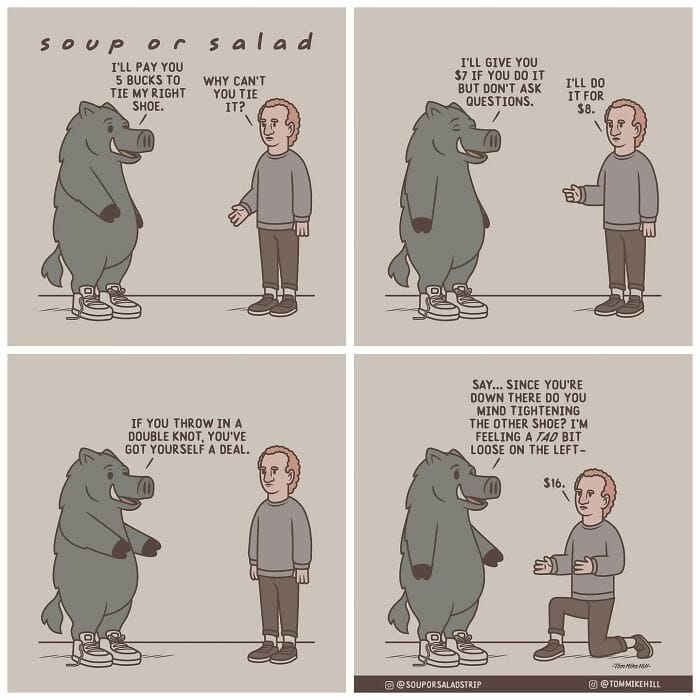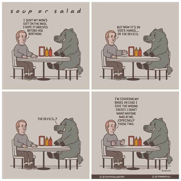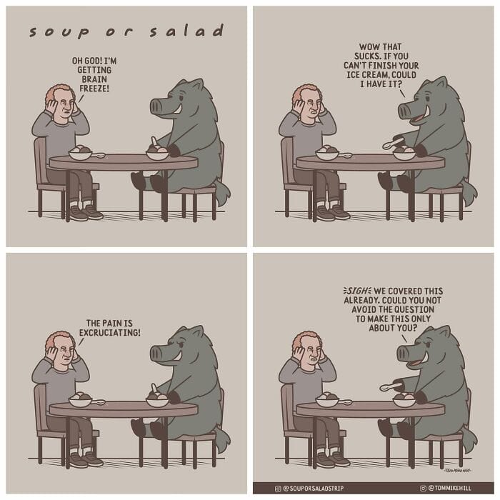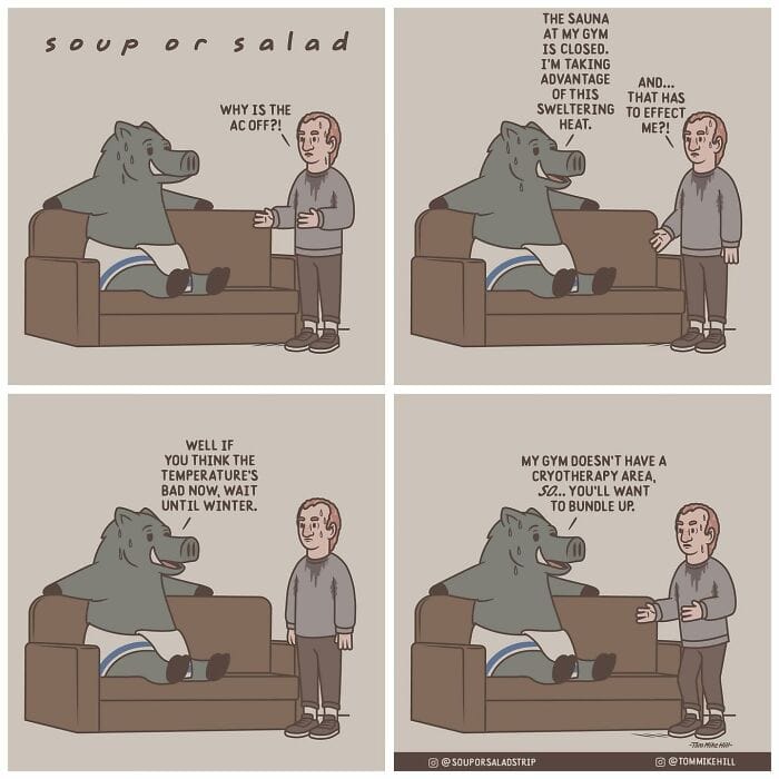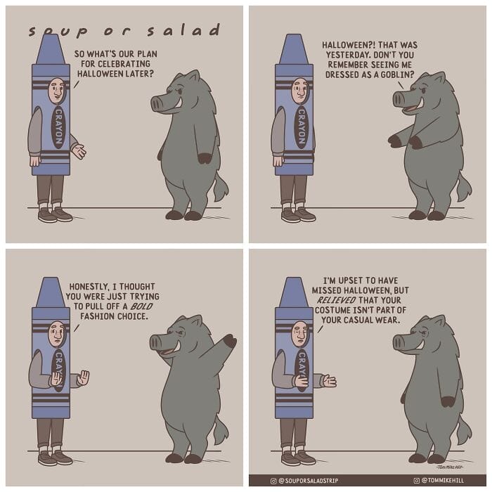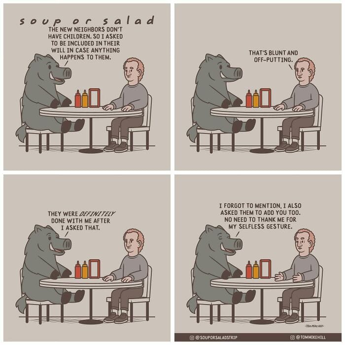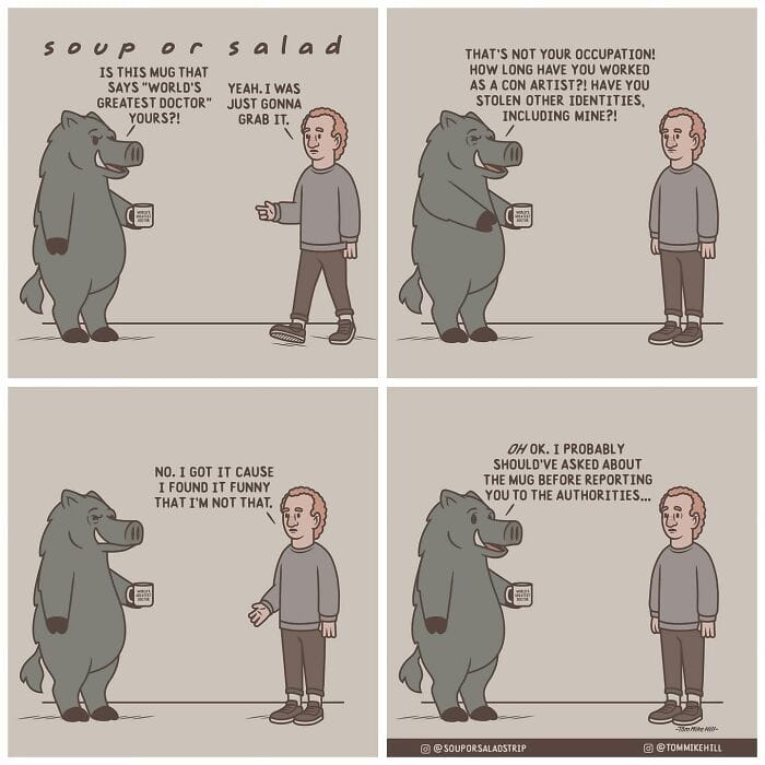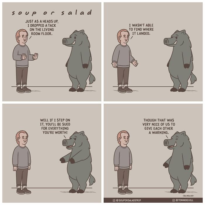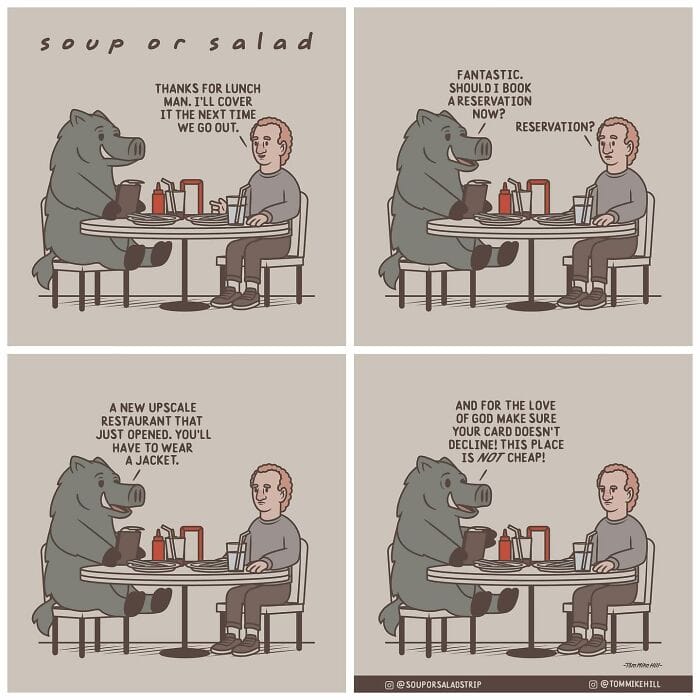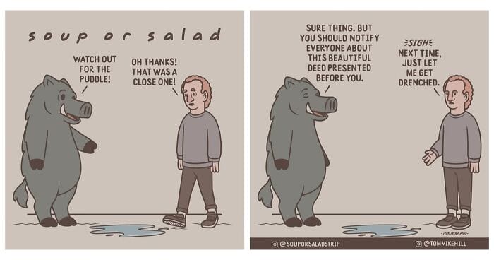 Soup or Salad is a webcomic series created by Tom Mike Hill, blending slice-of-life humor with lighthearted adventures featuring characters Ken and Russell. Hosted on platforms like WEBTOON and Tapas the series has gained a dedicated following thanks to its clever humor and charming storytelling. Beyond his webcomic work, Tom Mike Hill is an illustrator and designer with experience in logo design poster art and podcast visuals. But for now take a scroll through his hilarious Soup or Salad comics. We’re also excited to share an exclusive interview with Tom Mike Hill, where he opens up about the inspiration behind the series his creative process, and more.