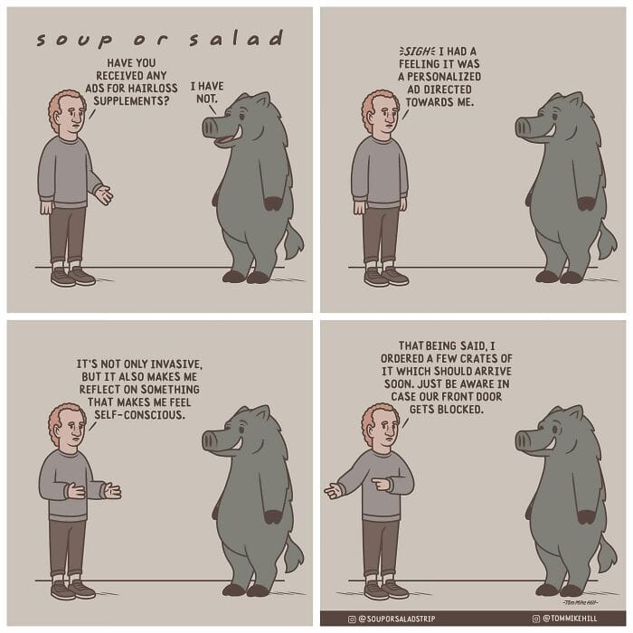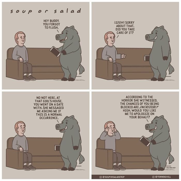 Visually, Tom didn’t want to just feature two humans. Initially, the plan was to have an anxious guy living with an alligator as a roommate, but after seeing a similar pairing in another comic, he searched for a different animal to create in anthropomorphic form. Ultimately, he landed on a boar. I’ve been releasing it weekly for four years now, and within the comic it has yet to be addressed that one of the characters is a walking-talking boar Tom laughed.