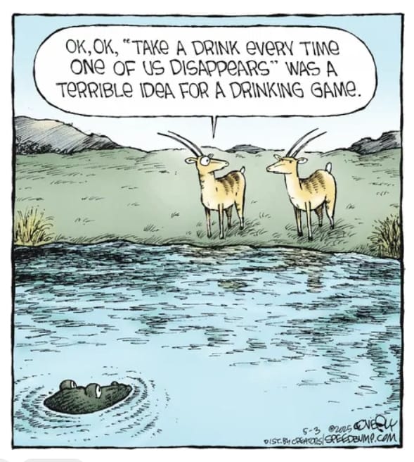 Two antelopes play a risky drinking game by taking a shot every time one of them “disappears.” The punchline hits as one floats in a crocodile’s mouth. It’s dark, ridiculous, and pure Speed Bump.