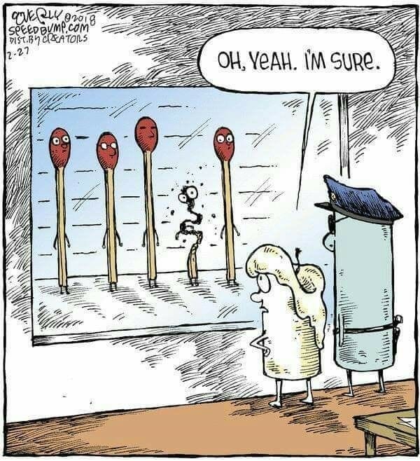 A burnt-out match is easily identified in a police lineup by a marshmallow victim. It’s a literal “burnout” joke—hot, crisp, and dry as kindling. This visual pun is laugh-out-loud brilliant.