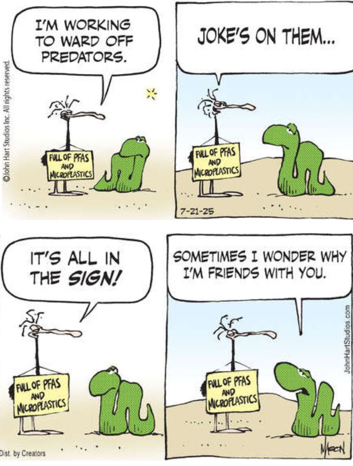 Modern problems invade the BC world when a lizard tries to ward off predators with a sign: “Full of PFAS and microplastics.” The twist? His friend wonders why they’re still pals. Stone age humor meets environmental satire, and the results are laugh-out-loud perfect.