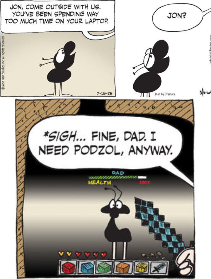Screen time problems? Even BC’s ants can relate! When Jon is told to step away from his “laptop,” it turns out he’s in a full-blown Minecraft adventure… podzol and all. The fusion of ancient and modern is what makes stone age humor so on point—plus, it’s a great excuse for another five minutes of play.