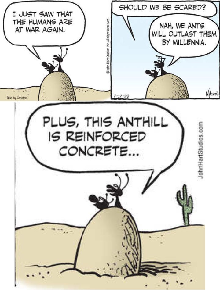 Humans at war again? Yawn. The ants aren’t worried—they’ve got reinforced concrete anthills! This comic delivers stone age humor with a dash of existential realism, poking fun at humanity’s woes while giving props to insect engineering. Who knew ants were the ultimate doomsday preppers?