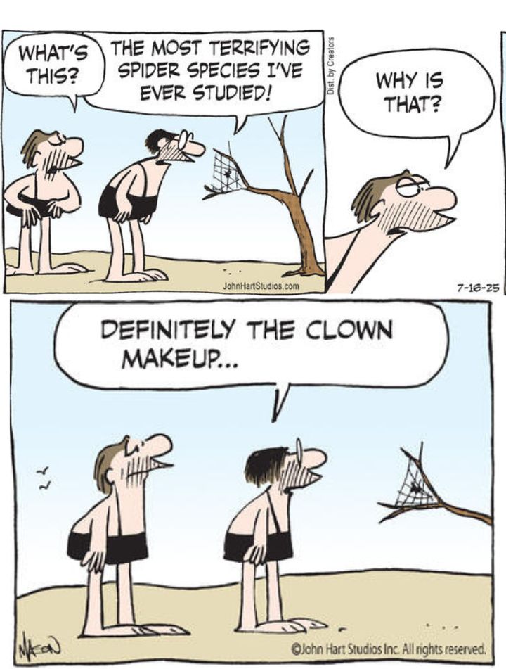 BC takes “terrifying spiders” to the next level, introducing the most horrifying species: the one with clown makeup. There’s something both hilarious and deeply unsettling about stone age humor when it involves spiders and circus nightmares. Bonus points for making us all check under our beds tonight.