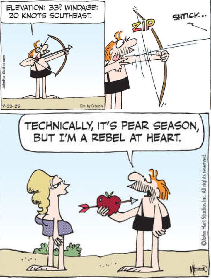 Who says you can’t break the rules? When aiming for a fruit, our archer’s heart wants apples—even though it’s pear season. This stone age humor panel nails the rebel spirit: sometimes, you just gotta be different, especially if it involves fruit and arrows.