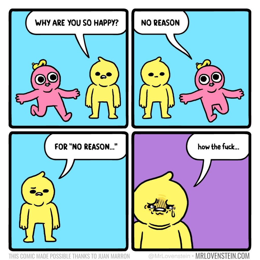 Why are you happy? No reason. Why are you sad? Also, no reason. This strip hits home for anyone whose mood is a wild ride. The last panel’s face is everyone on a Monday.