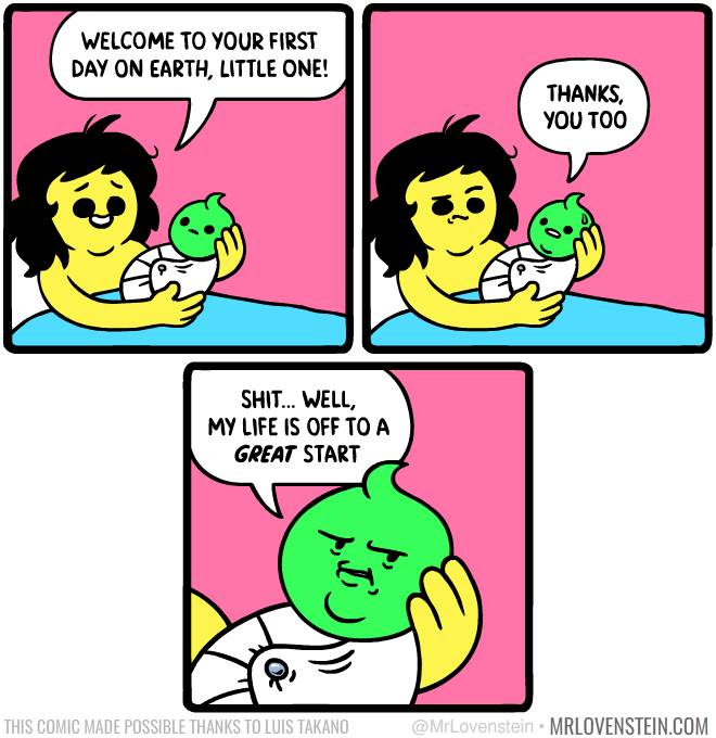 Being born is tough, but at least you can start your existential dread early. The baby’s face says it all: “Well, this is gonna be a long ride.”