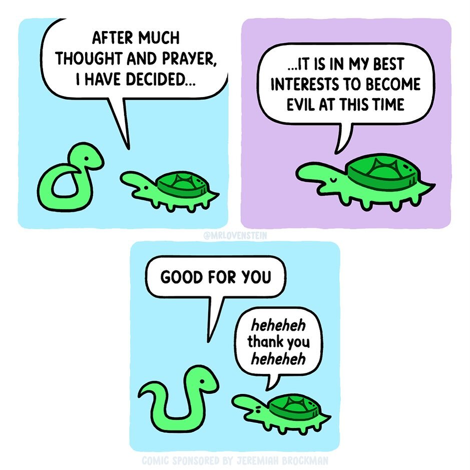 After “much thought and prayer,” sometimes you just gotta be evil. Even the turtle’s villain era is weirdly polite. That’s peak The Dark Humor energy.