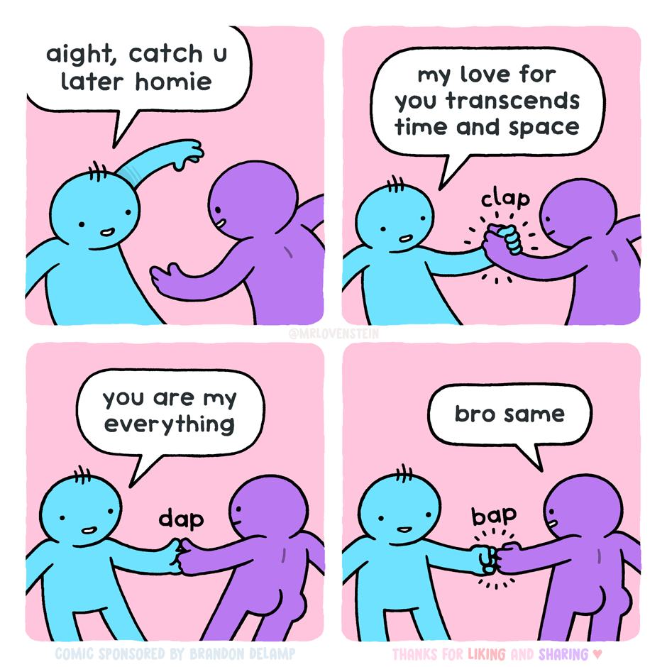 Guys showing love, but make it awkward. This strip escalates “bro” energy to Shakespearean heights, then brings it crashing down with a dap. Pure, wholesome chaos.