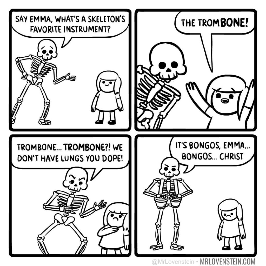 The classic “dad joke” about skeletons playing the trombone gets a sharp The Dark Humor twist—turns out skeletons are more into bongos (because, science?). Cue the existential laugh.