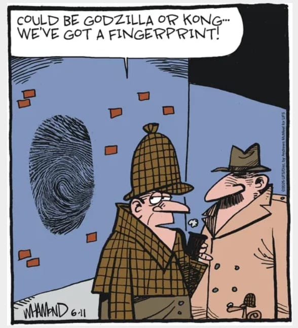 Sherlock Holmes and Watson analyze a Godzilla-sized fingerprint. “Could be Kong…” This one’s for monster movie nerds and dad joke lovers.
