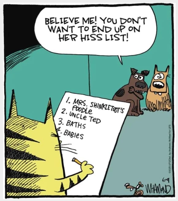 A cat scribbles names on her “Hiss List.” Mrs. Shinkletoot, Uncle Ted, and babies beware—feline vengeance is real.
