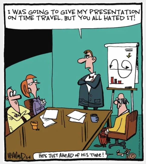A man bombs his presentation on time travel because everyone “already hated it.” Tough crowd—especially from the future.