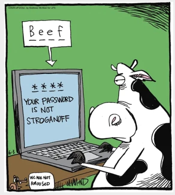 A cow is locked out of her computer. Password hint? “Not stroganoff.” Even bovines have cybersecurity beefs.