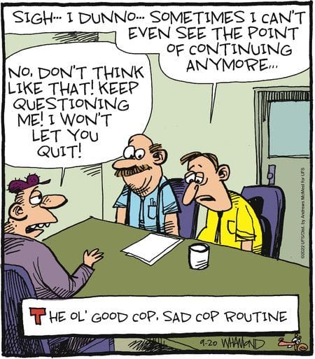 A suspect vents about existential dread, while a cop reassures, “Don’t give up questioning!” It’s therapy and interrogation in one awkward moment.