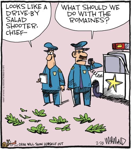 Police at a crime scene find lettuce: “Drive-by salad shooter.” The punchline? “What should we do with the romaines?” Arrest the pun immediately.